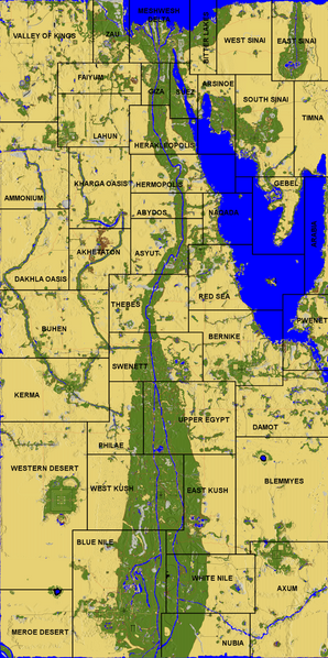 | 08:47, 19 February 2018 | 700 × 1,400 (1.83 MB) | Shams (talk | contribs) | This map was made by taking the colorful thumbnail provided by Malard, scaling it up onto a full Egypt map, drawing the outlines, then labeling them. The lines are not coordinate-perfect. This is just for reference. |